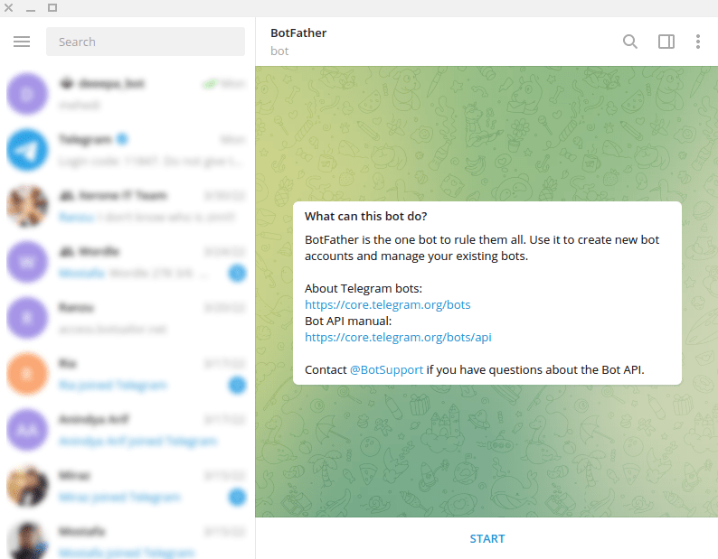 To build a Telegram bot with WokieTokie.io, first, open your Telegram App. Then in the search bar of the app, search with the ‘BotFather’ keyword. Then select the verified BotFather account.