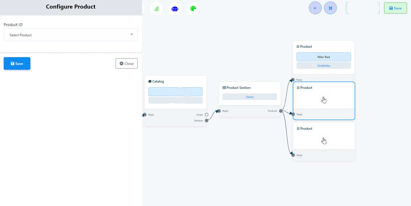 5. Once you have configured your ecommerce store within the flow builder, make sure to save your changes. Afterward, you can publish your chatbot with the ecommerce feature.