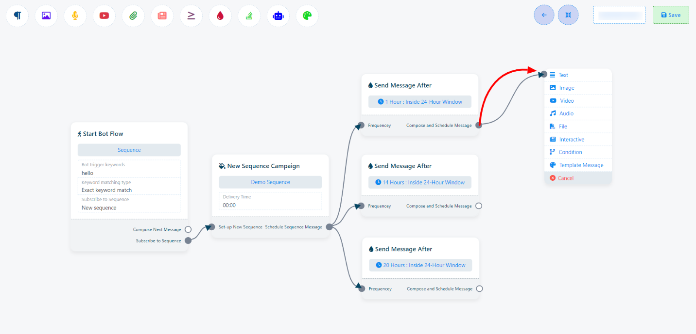 In practical terms, it allows you to configure a series of messages that are sent at precise time intervals, ensuring that communication with users remains timely and contextually relevant.