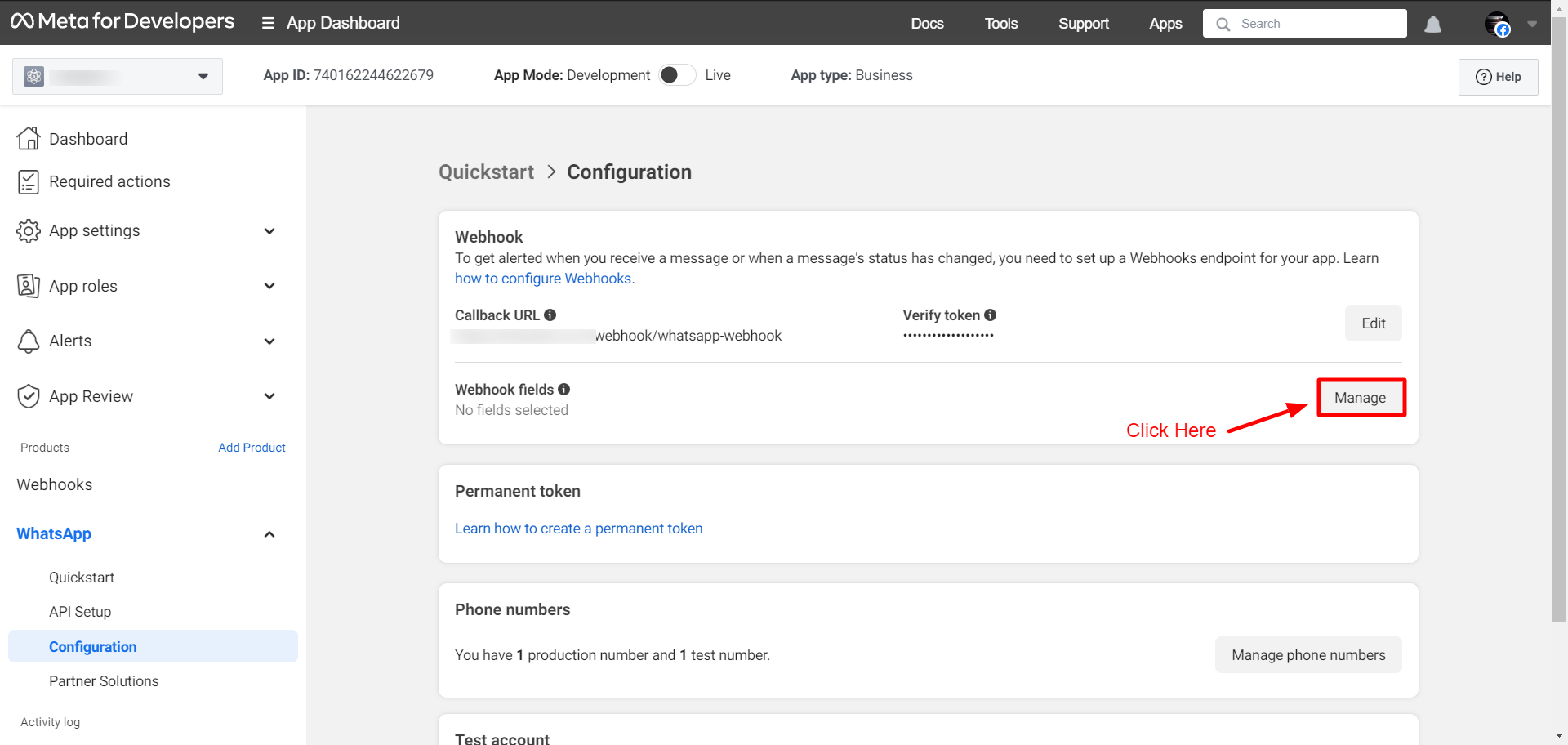 Now you have to select webhook fields. To select webhook fields, click on the Manage button.