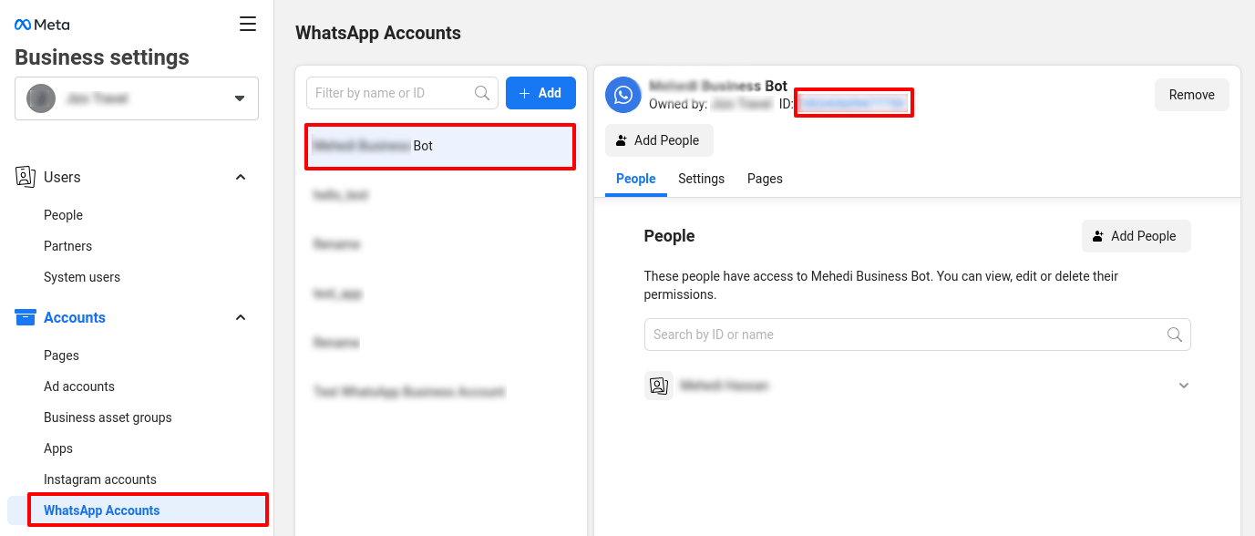 To get the WhatsApp Business Account ID, go to the Business settings page. Then at the left sidebar of the page, select the WhatsApp account menu. Instantly, the WhatsApp Accounts section will appear. Now select your app and copy the WhatsApp Business Account Id.